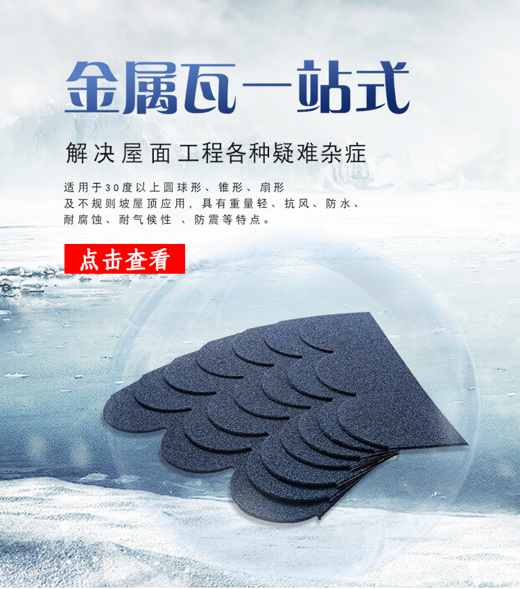 金屬魚鱗瓦表面顯圓錐凸感,高檔、雅致,復古中帶有現(xiàn)代感,淡雅含蓄,細膩天成,立體感強。適用于30°以上的圓球形、錐形、扇形及不規(guī)則坡屋頂?shù)膽?/div>